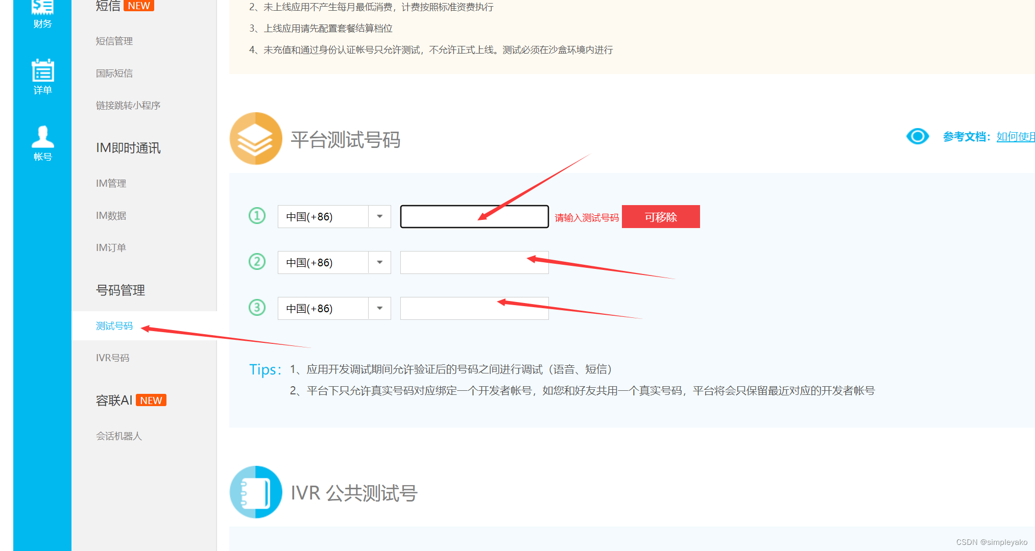 4、填写测试号码(用于测试接受短信),下载容通讯SDK