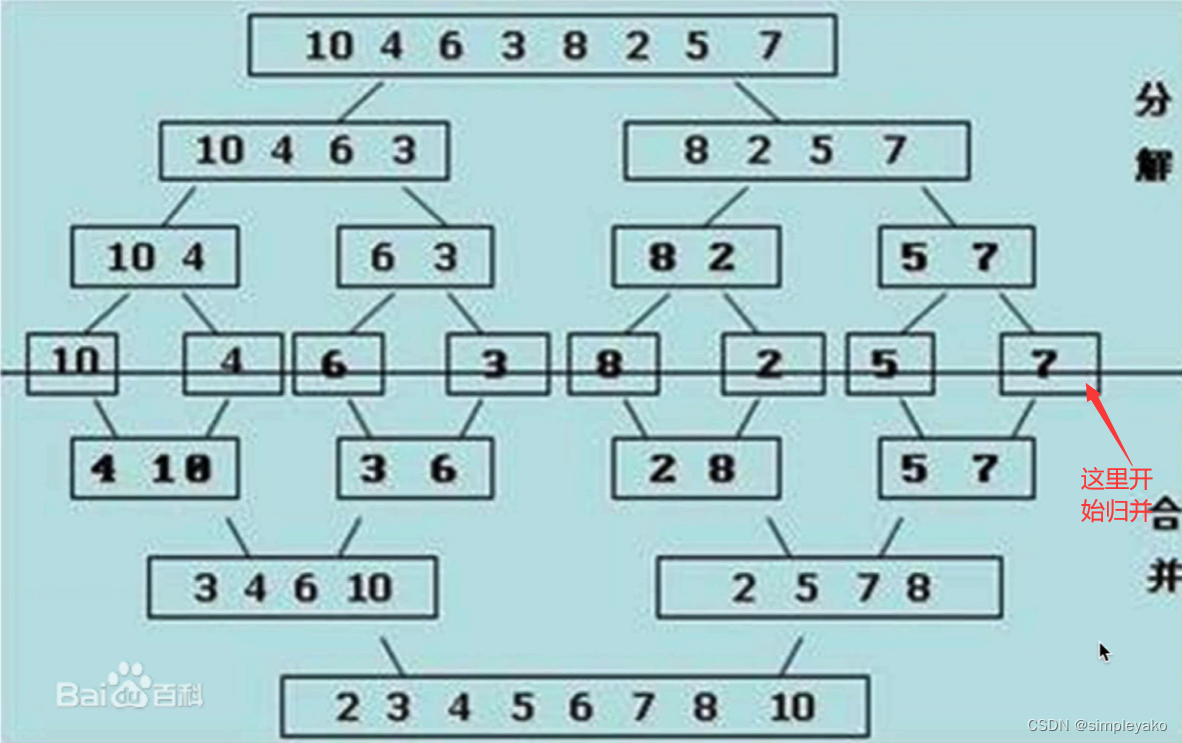 既然可以通过一次归并操作将左右两方的列表元素进行对比排序,那么我们可以只对列表中每每两个两个元素进行归并,如图