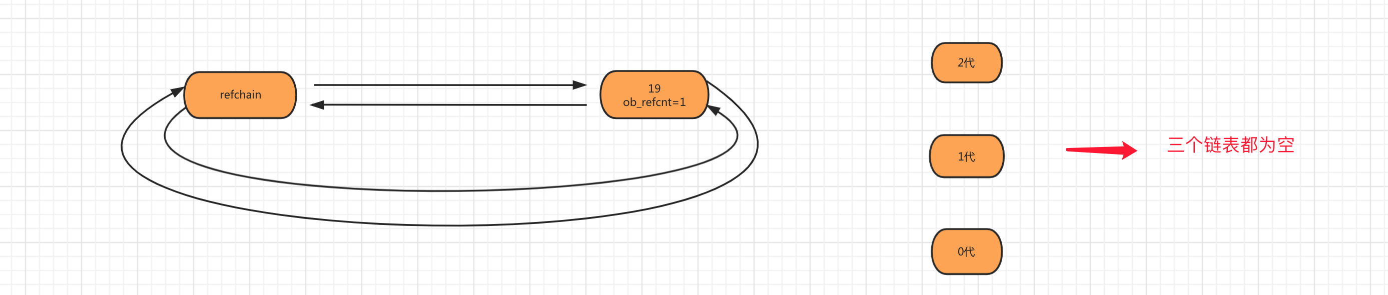创建特殊链表专门用于保存 列表、元组、字典、集合、自定义类等对象,之后再去检查这个链表中的对象是否存在循环引用,如果存在则让双方的引用计数器均 - 1 ,此时对于垃圾回收存在两个两个链表:
