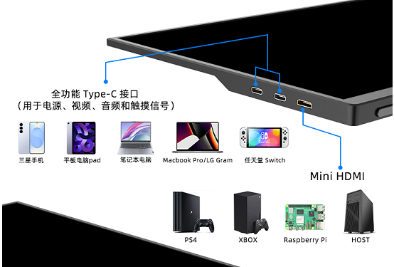 A:绝大多数现代设备都支持。只要你的手机或笔记本具备USB-C(支持DisplayPort Alt Mode)或HDMI输出功能,就能连接便携式显示器。苹果MacBook、Windows笔记本、安卓旗舰手机(如三星Galaxy、华为Mate/P系列)、iPhone(部分型号需转接)以及Nintendo Switch等主流设备均可兼容。建议在购买前确认设备接口规格,并选择对应接口的显示器型号。
