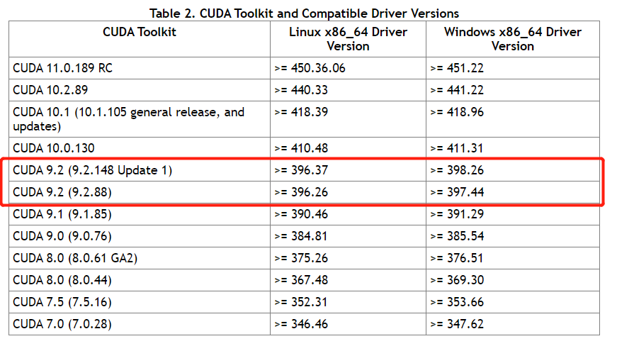 从这个地址中,找到上面这个表格,可以看到我的显卡可以支持框中这两个版本的GPU。