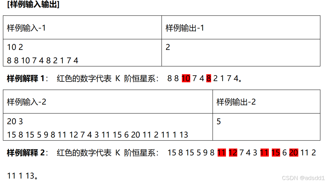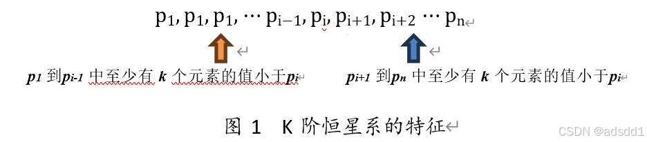 半人马座 A 是个巨大的椭圆星系, 具有 n 个恒星。和太阳系一样, 每个恒星 周围 都有许多行星。小可可团队通过太空望远镜,观测出每个恒星系里行星的数 量, 其中第 i 个恒星系里有 pi(1 ≤ i ≤ n)个行星。若第 i 个恒星系为小可可 定义的 K 阶恒星 系,则在正整数序列 p1,p2, … pn 中, pi 的左边和右边都至少有 k 个元素的值小于 pi (如图 1 所示)。(这个图有些错误,前面的p1,p1,p1应该是p1,p2,p3)