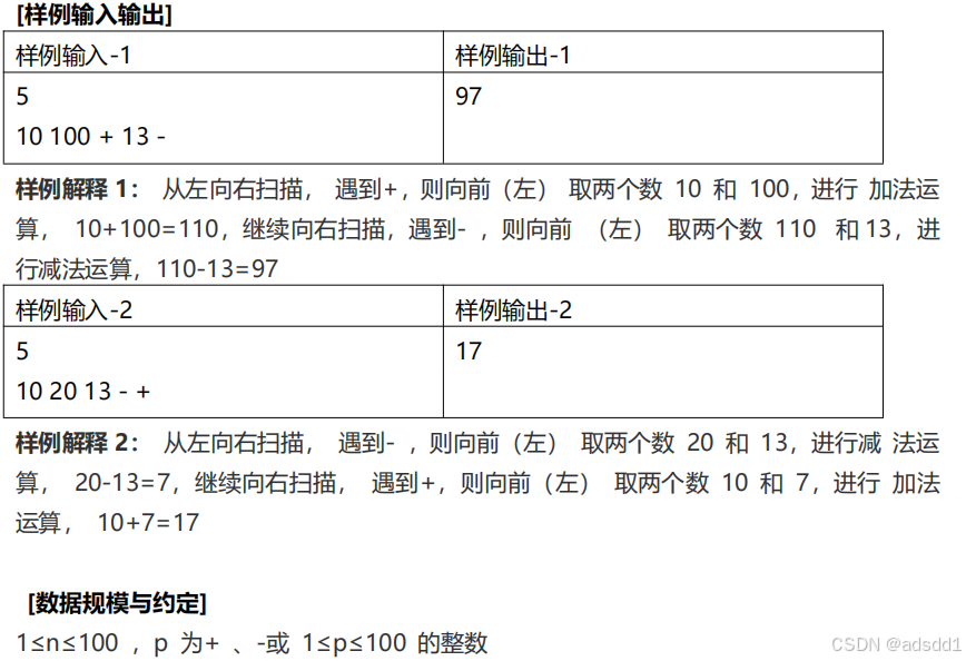 共 2 行。第一行 1 一个正整数 n,表示逆波兰式中数值的个数(包括运算 符和运算数),