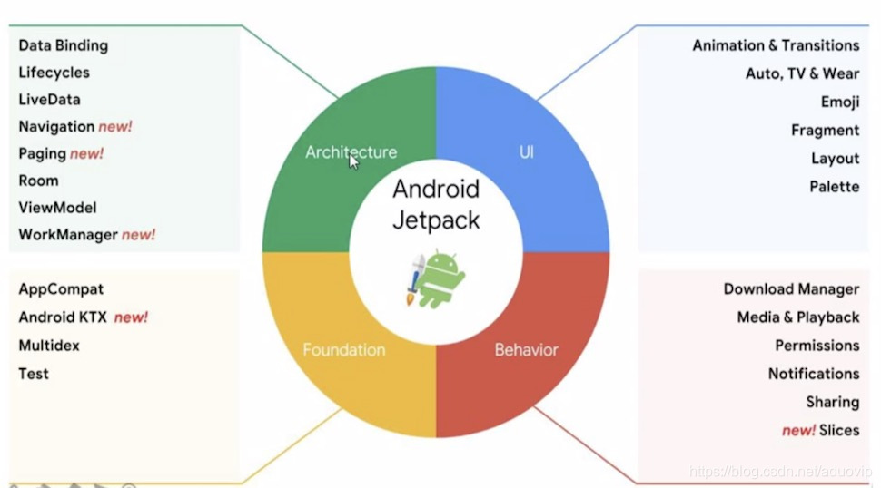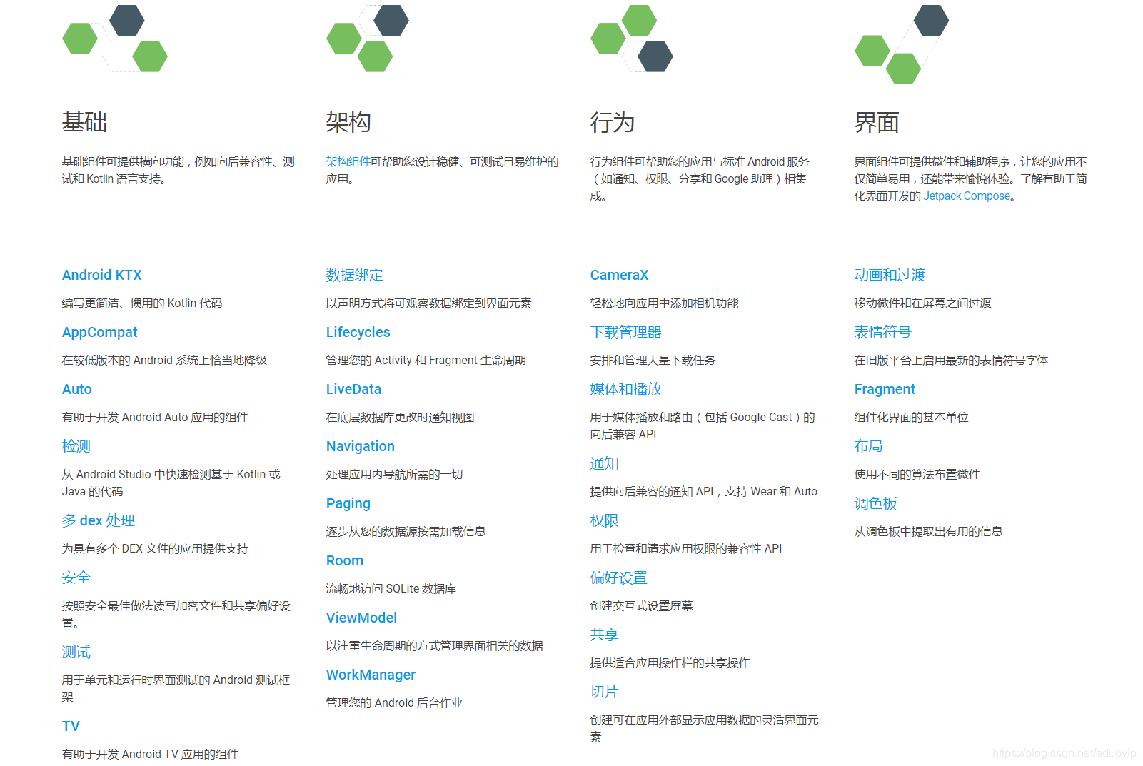 可以看到, Jetpack 由基础、 架构、行为、界面 4部分组成。