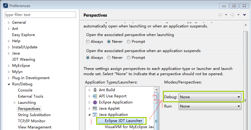 解决: 依次点击 window->preferences->Run/Debug->Perspectives, 在窗口右边下部 Application Types/Launchers: