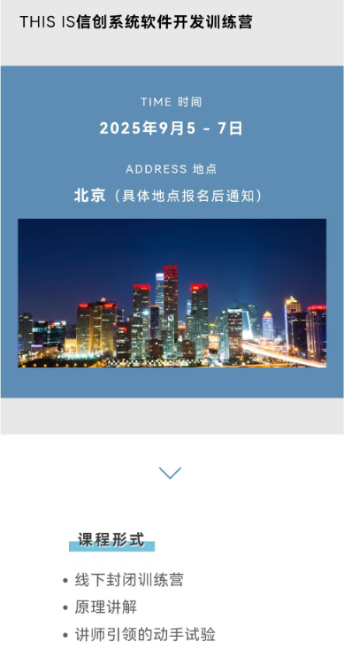 学,然后知不足。专门为底层技术同行开办的《信创系统软件开发训练营(2025北京站)》正在招生中,欢迎感兴趣的同行联系我们。也希望大家帮忙把这个消息传播给其他可能需要的同行。