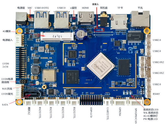 WK | 绿色 | 工作状态指示灯,,软件可以通过GPIO1_D3(序号59) 进行控制,序号的计算规则为32 + 24 + 3 = 59 |