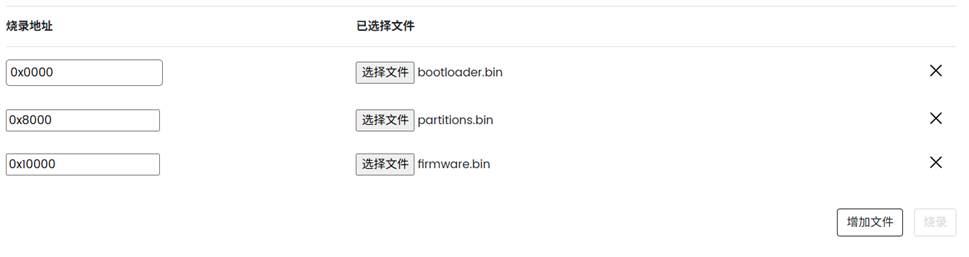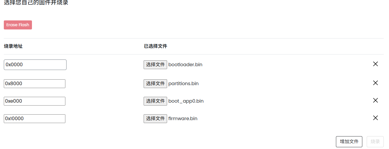 当然其他网站上还有说需要在0xe000为烧写boot_app0.bin,实测我没有加这个文件也不影响