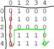 依据下右上左的优先级,设点A从(0,0)出发,第一次的路径为(0,0)->(1,0)->(2,0)->(3,0)->(4,0),当走到(4,0),发现没有路了,只能回头一步到(3,0),还是没有路,再回头一步到(2,0),发现(2,0)有一条向右的路可以走,沿着这条路走,可以最后直达(4,4)。