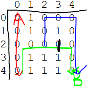 依据下右上左的优先级,设点A从(0,0)出发,第一次的路径为(0,0)->(1,0)->(2,0)->(3,0)->(4,0),当走到(4,0),发现没有路了,只能回头一步到(3,0),还是没有路,再回头一步到(2,0),发现(2,0)有一条向右的路可以走,沿着这条路走,
