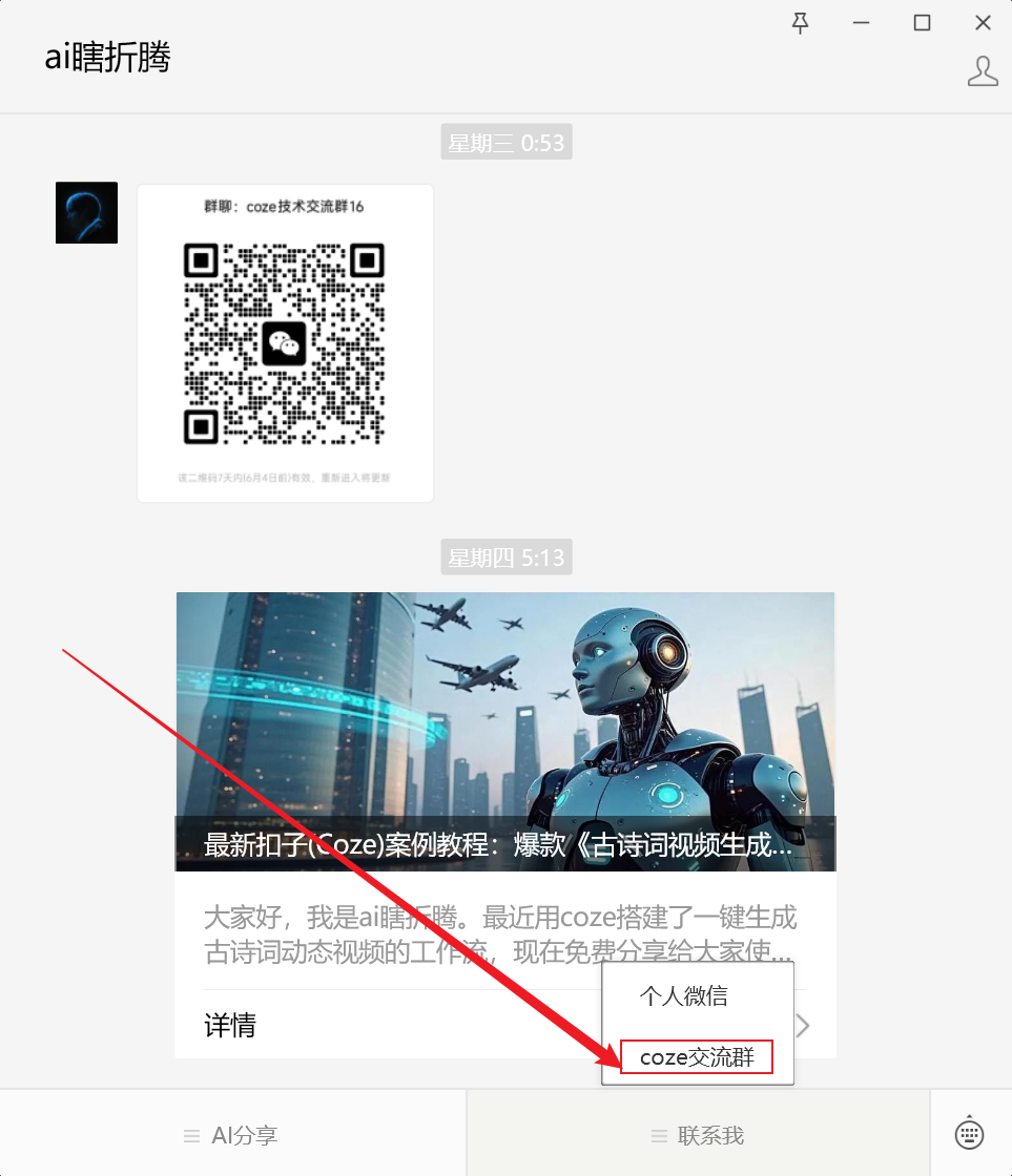 以上就是今天的分享,大家在使用的过程中如有问题,欢迎随时私我,欢迎加入coze交流群,交流群获取方式:公众号搜索“ai瞎折腾”,关注后点击“联系我”获取进群二维码。