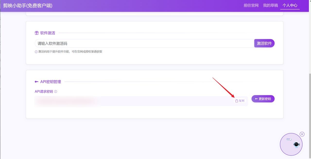 aipkey:速推AIGC的apikey,在剪映小助手的“个人中心”划到最地下获取