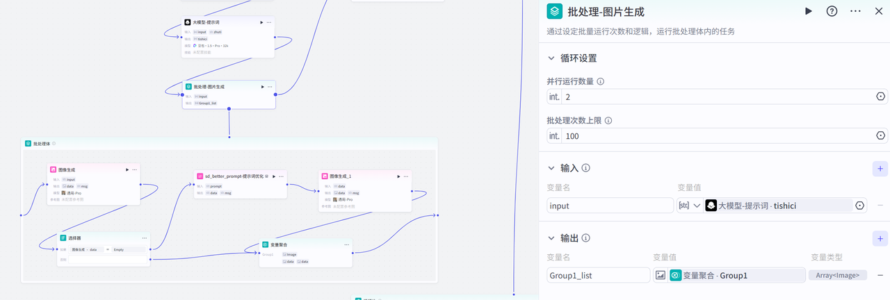 该节点主要生成图片,为避免部分图片生成失败,增加了图片生成失败后,重新优化提示并再次生成图片