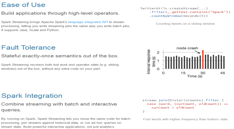 Spark Streaming是核心Spark API的扩展,可实现可扩展、高吞吐量、可容错的实时数据流处理。数据可以从诸如Kafka,Flume,Kinesis或TCP套接字等众多来源获取,并且可以使用由高级函数(如map,reduce,join和window)开发的复杂算法进行流数据处理。最后,处理后的数据可以被推送到文件系统,数据库和实时仪表板。而且,您还可以在数据流上应用Spark提供的机器学习和图处理算法。