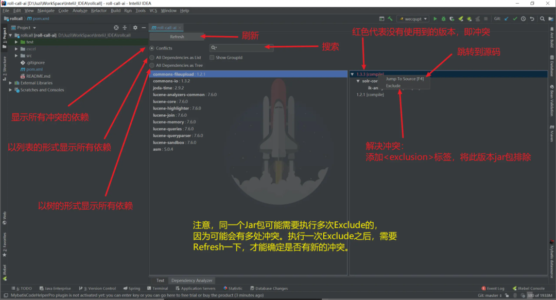 找到冲突,点击右键,然后选择Exclude 即可排除冲突版本的Jar包。
