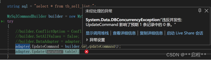 这篇博客探讨了在使用MySqlDataAdapter.Update时遇到的两种错误:System.InvalidOperationException和System.Data.DBConcurrencyException。问题一源于没有返回键列信息的SelectCommand,解决方案是为表添加主键。问题二是并发性冲突,导致UpdateCommand未能更新预期的记录,解决方法是通过添加特定代码来处理并发问题。