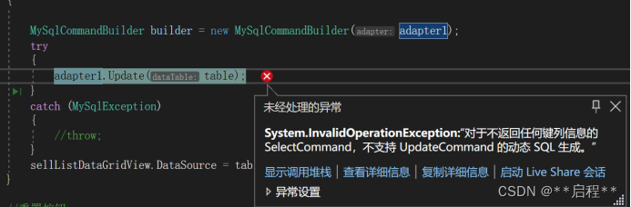 System.InvalidOperationException:“对于不返回任何键列信息的 SelectCommand,不支持 UpdateCommand 的动态 SQL 生成。”