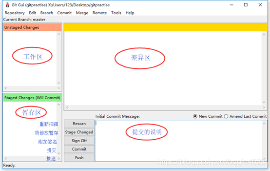 Rescan:扫描出改动的文件,显示在工作区。GUI并不会实时更新对仓库的修改,需要点击Rescan按钮重新扫描。