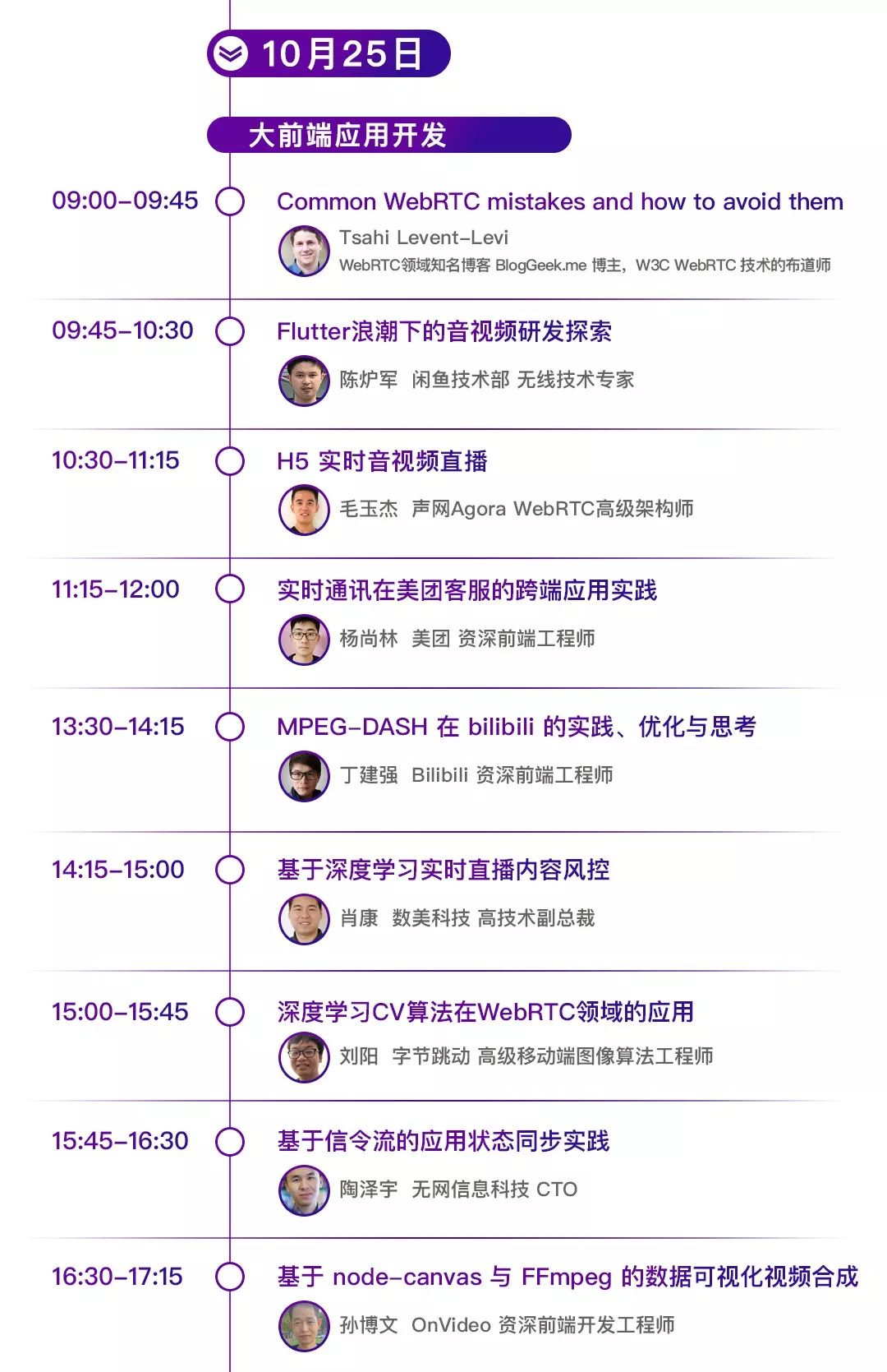 今年的演讲主题涉及实时网络传输、编解码、深度学习、大前端、跨平台开发等技术话题,以及实时交互、5G 、音视频处理等相关场景。具体议程,请见文末日程表。