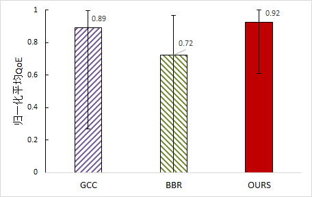 为评估基于强化学习的全链路网络流控的性能,我们选取当前先进的谷歌拥塞控制(Google Congestion Control,GCC)和瓶颈带宽与往返时延(Bottleneck Bandwidth and Round-trip time,BBR)算法进行了对比实验,结果如图 2 所示。可以看出,相对于 GCC 和 BBR 算法,我们可以提升分别 3.6%和 27.9%的归一化平均 QoE 分数。其中,我们以所有测试样本取得 QoE 的最小值与最大值进行归一化处理。