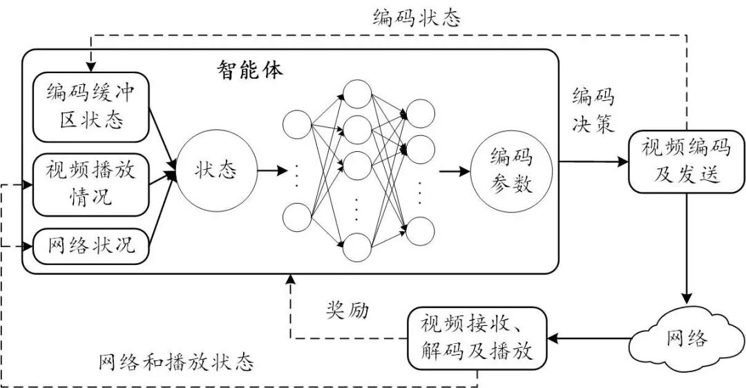 从 AlphaGo 开始,强化学习在任务决策方面展现了非凡的能力;三年前,我们提出基于强化学习的网络流控,自适应侦测调节带宽反馈给发送方优化视频压缩;这样的过程虽然带来了可见的效果,但是并没有真的解决网络流控和视频压缩流控的核心矛盾;网络流控的难点在于异构性,视频压缩的流控难点是内容多样性。近期,我们将强化学习的决策机制同时涵盖编码和传输,全链路 AI 控制(状态采集,决策预判),实现更加精准的带宽控制;