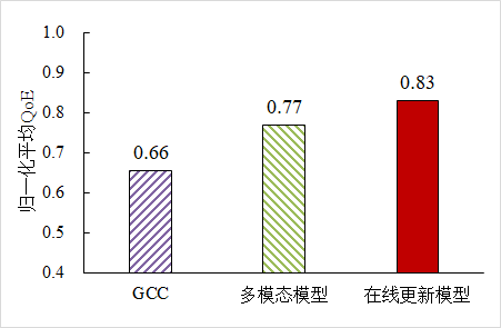 鉴于图 2 中 BBR 性能差于 GCC,我们选取 GCC 算法作为评估网络多模态感知进行在线建模和推理性能的对比对象,结果如图 4 所示。对比于 GCC 算法,多模态码率自适应模型可以提升 9.1%归一化平均 QoE。其中,我们以测试样本取得 QoE 的最小值与最大值进行归一化处理。在线建模与推理方法相对于 GCC 算法,能够提升约 15.1%归一化平均 QoE,并且在训练时也达到相对稳定和可接受的码率自适应性能。