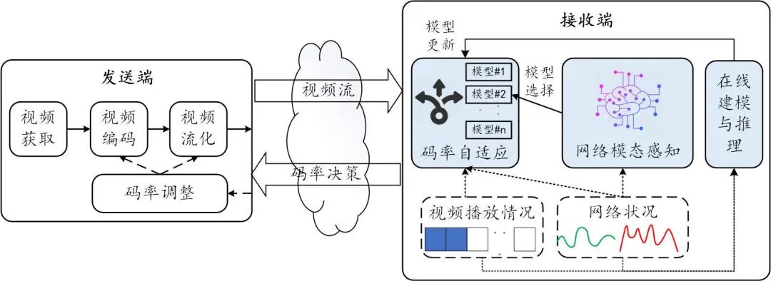 为此,我们引入了网络多模态感知进行在线建模和推理,其系统框图如图 3 所示。发送端经过视频获取、视频编码和视频流化等处理后将视频流发送到网络上,接收端接收视频数据进行解码和播放等操作,并收集网络状况和视频播放情况相关数据。为减小码率决策时延,我们将网路模态感知、码率自适应和在线建模与推理模块部署在接收端。首先,通过分析和挖掘历史网络状态特征,识别当前网络模态,初步感知整体网络质量情况。之后,使用基于强化学习理论的多模态码率自适应,依据网络模态动态切换码率自适应模型,从而针对不同网络状况精细化生成不同的码率自适应决策算法。在实际新网络环境下,基于多模态码率自适应模型应用在线建模和推理,进一步面向当前环境更新和优化模型和算法,解决新环境下模型性能退化问题。一次码率决策完成后,接收到通知和指导发送端的视频编码和视频流化模块对编码码率和发送码率进行调整,以抵抗动态网络波动。
