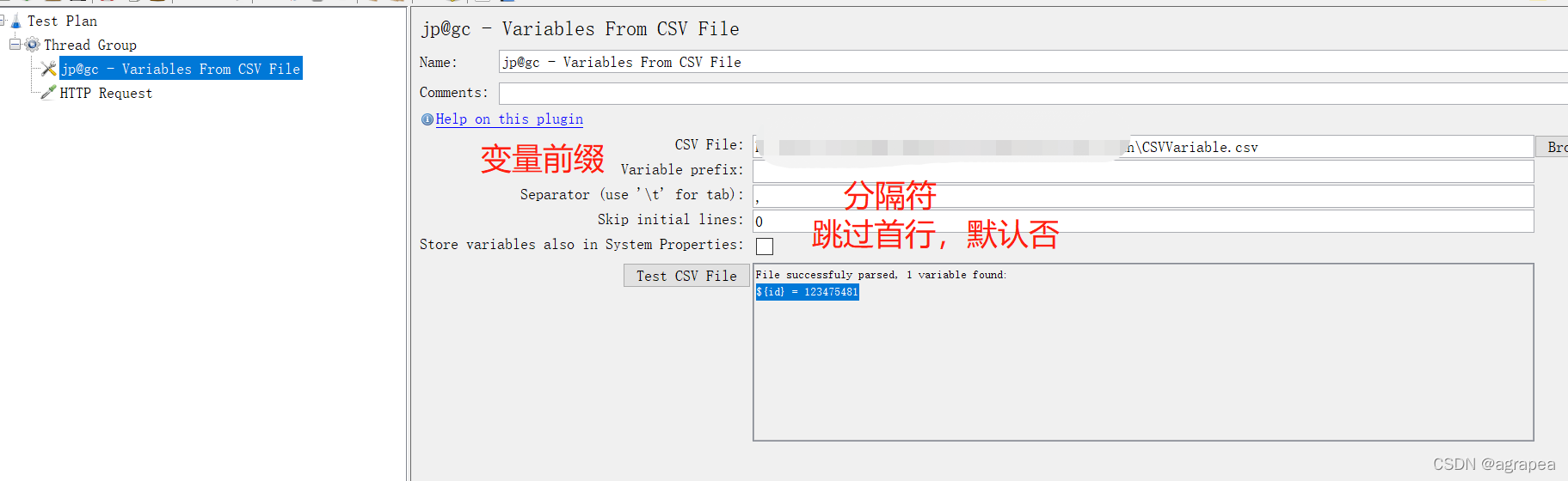 在线程组下增加一个config element>jp@gc - Variables From CSV File