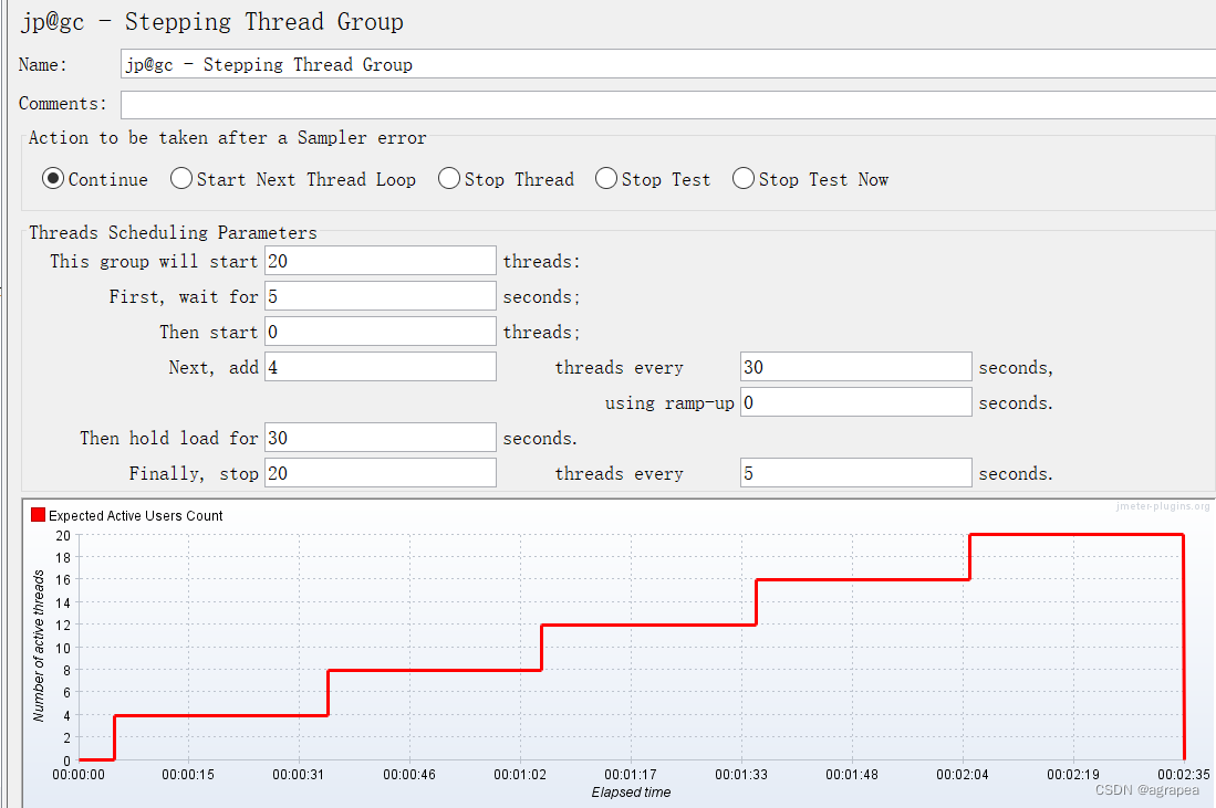 那是不是只要将不同线程数量执行时的数据分开显示就可以一次完成多次执行的事情?今天看论坛时无意中得到启动,可以通过stepping Thread Group进行不同线程数量的加压,具体参数说明上一节已讲过,现设置如下,总共启动20个线程,分5次加压,每次增加4个线程,每次持续30秒。