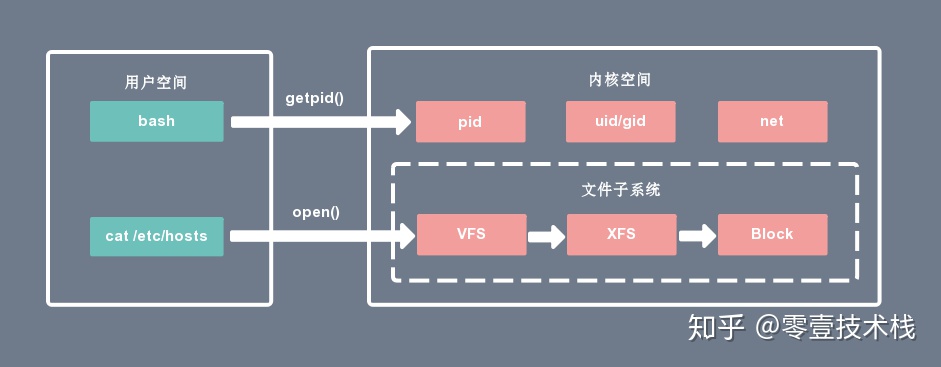 内核态可以执行任意命令,调用系统的一切资源,而用户态只能执行简单的运算,不能直接调用系统资源。用户态必须通过系统接口(System Call),才能向内核发出指令。比如,当用户进程启动一个 bash 时,它会通过 getpid() 对内核的 pid 服务发起系统调用,获取当前用户进程的 ID;当用户进程通过 cat 命令查看主机配置时,它会对内核的文件子系统发起系统调用。