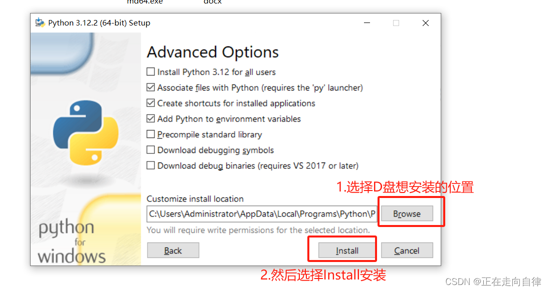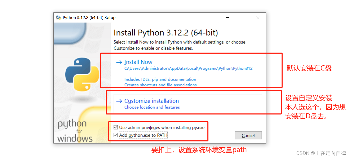 2)如下图,建议选择自定义安装,确保勾选 "Add Python.exe to PATH" 选项(将 Python 添加到系统环境变量中,这样可以在命令行中直接运行 python 命令)。