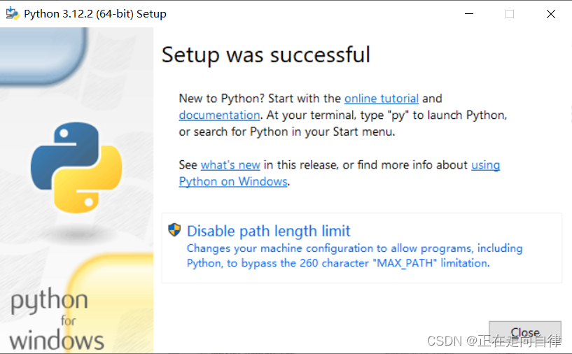 5)如下图,有一个提示Disable path length limit 点击关闭长度的限制,点击它然后安装完成。
