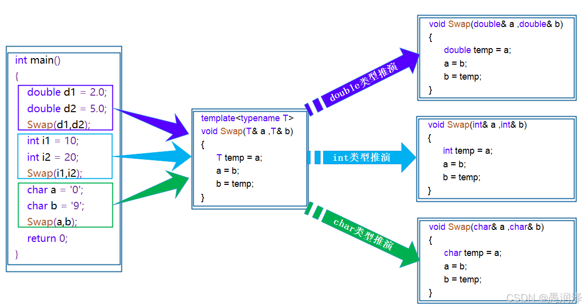 当程序中调用函数模板并为类型参数指定具体类型时,编译器会根据该类型生成一个特定的函数实例。每个实例都是一个独立的函数,可以像普通函数一样被调用和执行。