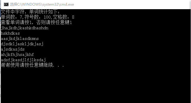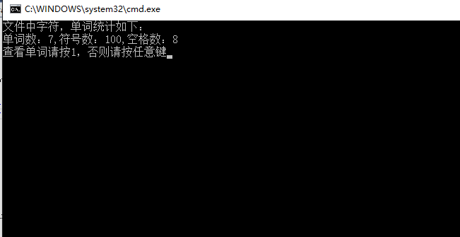 #include<stdio.h> #include<ctype.h> #include<stdlib.h> int character = 0;//字符数 int word = 0;//单词数 int space = 0;//空格数 char words[1000];//单词存储 int wordnum = 0;//单词存储的数组位置 int Word(char *f);//检验是否为单词 int show();//显示单词 int main() { int choice;//选择的输入 FILE *fp;//文件指针 char c; //文件字符读取存储 fp = fopen("D:\\a\\a.txt", "r"); if (fp == NULL) { printf("文件打开失败"); return 0; } while (feof(fp) != 1) { c = fgetc(fp); if (isalnum(c) != 0 || c == '_' || c == '.') { Word(fp); words[wordnum] = c; wordnum++; } else if (c == ' ') { space++; } else { character++; } } printf("文件中字符,单词统计如下:\n"); printf("单词数:%d,符号数:%d,空格数:%d\n", word, character, space); fclose(fp); printf("查看单词请按1,否则请按任意键"); scanf_s("%d", &choice); if (choice == 1) { show(); } else return 1; } int Word(char *f) { char c; while (feof(f) != 1) { c = fgetc(f); if (isalnum(c) != 0 || c == '_' || c == '.') { character++; words[wordnum] = c; wordnum++; } else if (c == ' ') { space++; word++; words[wordnum] = ' '; wordnum++; return 1; } else { word++; words[wordnum] = ' '; wordnum++; return 1; } } } int show() { int a; for (int i = 0; i < wordnum -1; i++) { if (words[i] == ' ') { printf("\n"); continue; } printf("%c", words[i]); } printf("谢谢使用"); }