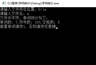 #include<stdio.h> #include<ctype.h> #include<stdlib.h> #include<string.h> int character=0;//字符数 int word=0;//单词数 int space=0;//空格数 char words[1000];//单词存储 int wordnum=0;//单词存储的数组位置 int Word(char *f); int show();//显示单词 int main() { int choice;//选择的输入 FILE *fp;//文件指针 char c; //文件字符读取存储 char filename[20] ; char place[10]; char Openname[40]; printf("请输入文件所在位置:"); gets(place); printf("请输入文件名:"); gets(filename); strcat(filename, ".txt"); strcpy(Openname,place); strcat(Openname,"\\"); strcat(Openname,filename); fp = fopen(Openname, "r"); if (fp == NULL) { printf("文件打开失败"); return 0; } while (feof(fp) != 1) { c = fgetc(fp); if (isalnum(c) != 0 || c == '_' || c == '.') { Word(fp); words[wordnum] = c; wordnum++; } else if (c == ' ') { space++; } else { character++; } } printf("文件中字符,单词统计如下:\n"); printf("单词数:%d,符号数:%d,空格数:%d\n", word, character, space); fclose(fp); printf("查看单词请按1,否则请按任意键"); scanf_s("%d", &choice); if (choice == 1) { show(); } else return 1; } int Word(char *f) { char c; while (feof(f) != 1) { c = fgetc(f); if (isalnum(c) != 0 || c == '_' || c == '.') { character++; words[wordnum] = c; wordnum++; } else if(c==' ') { space++; word++; words[wordnum] = ' '; wordnum++; return 1; } else { word++; words[wordnum] = ' '; wordnum++; return 1; } } } int show() { int a; for (int i = 0; i < wordnum+1; i++) { printf("%c", words[i]); } printf("谢谢使用"); }