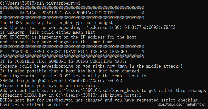此时,如果笔记本电脑以前连接过树莓派,此次再连接,可能会出现如下: