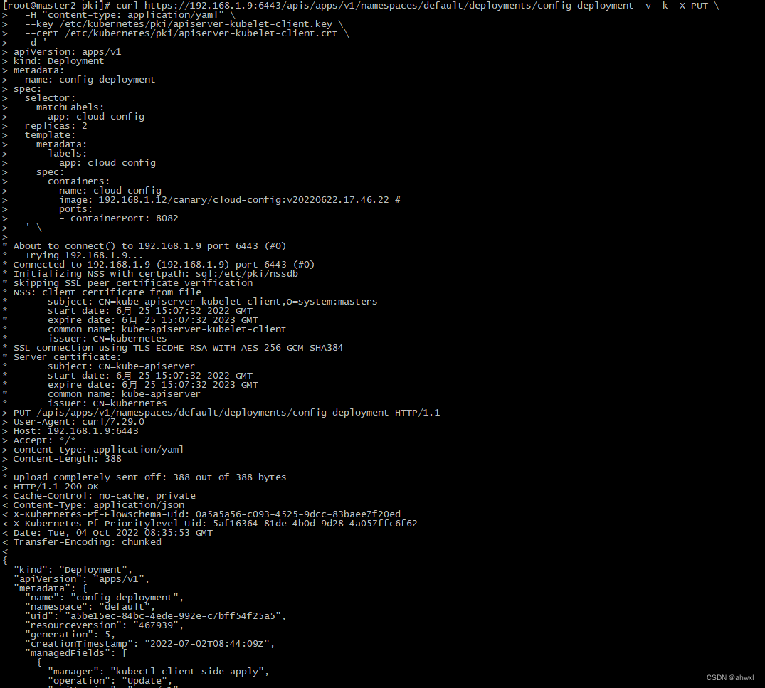 curl https://192.168.1.9:6443/apis/apps/v1/namespaces/default/deployments/config-deployment -v -k -X PUT \