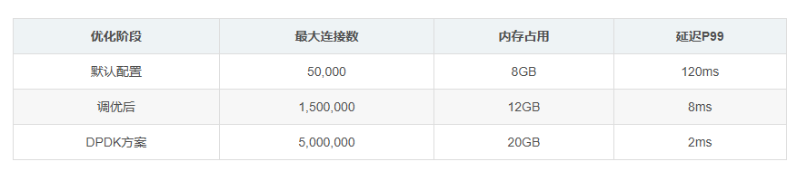 在字节跳动视频架构的实践中,通过上述方案成功实现单机150万并发连接稳定运行,连接建立延迟<5ms,内存开销降低40%。关键指标对比如下: