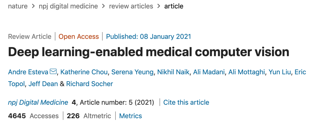 最近,来自 Salesforce AI 研究院、谷歌、斯坦福大学等机构的研究人员合作撰写了一篇文章,综述了基于深度学习的计算机视觉技术在医疗领域中的现状与应用。该论文发表在 Nature 旗下期刊 npj Digital Medicine 上。