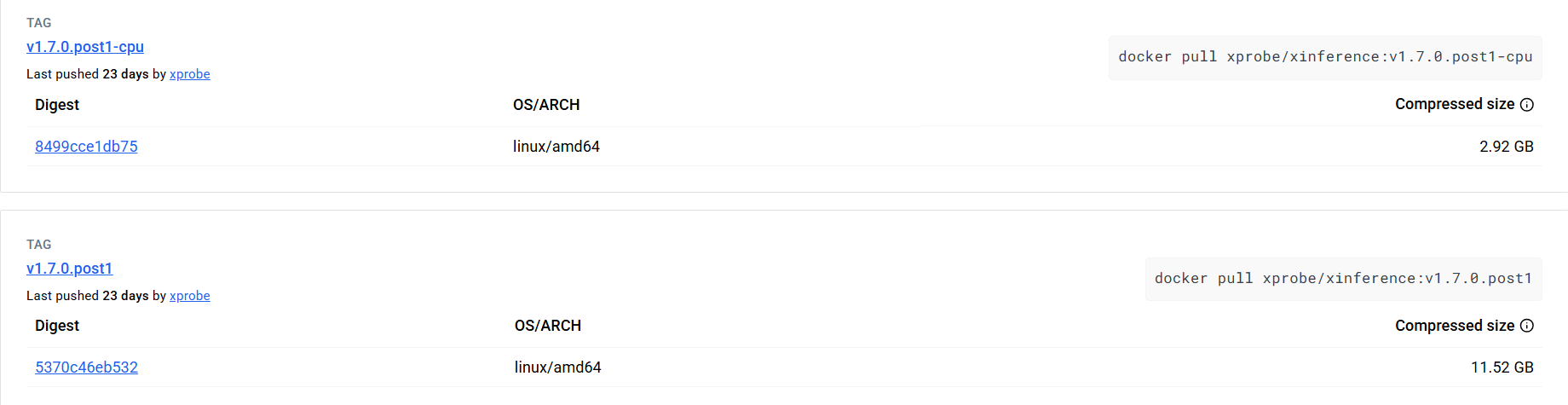 $ docker pull xprobe/xinference:v1.7.0.post1-cpu