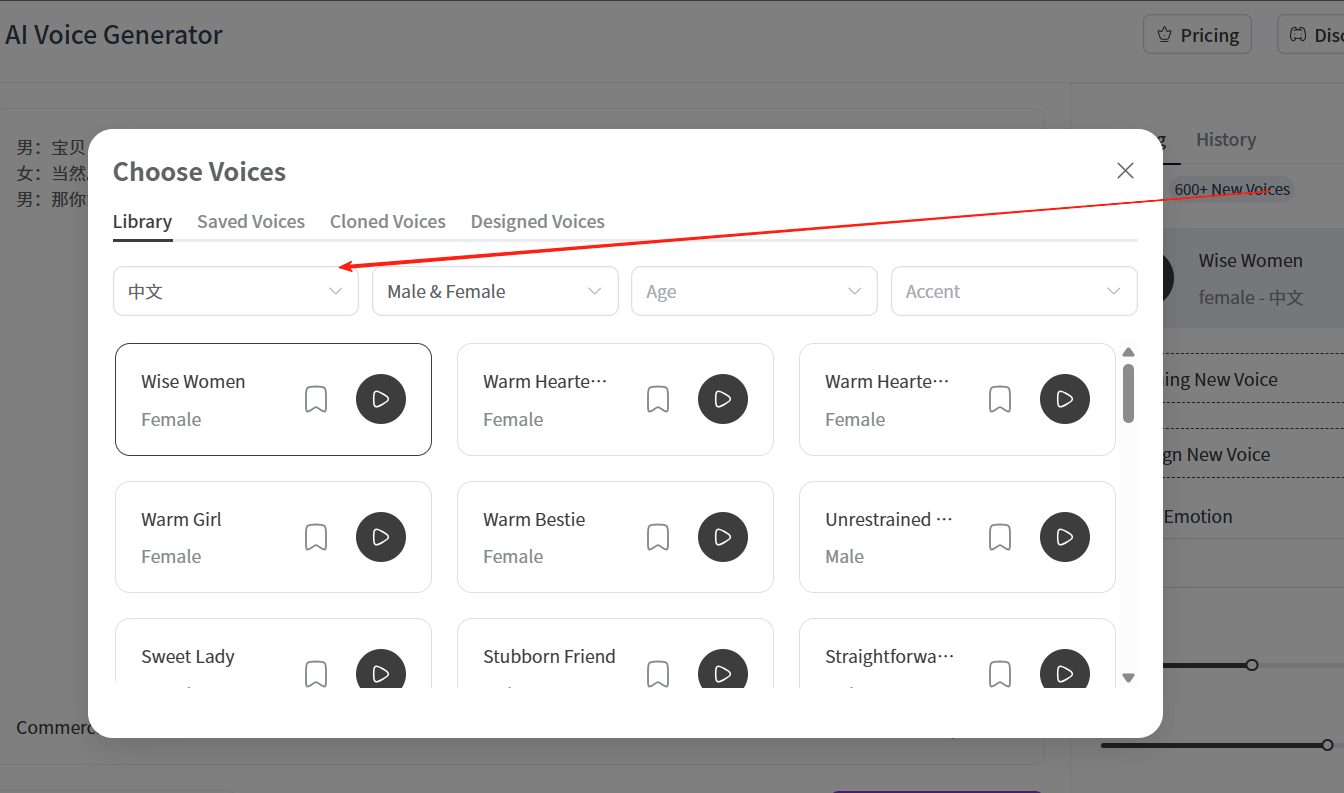 从工具提供的语音库中选择合适的语言和风格。AIVocal.io 提供 600+ 种语音,覆盖多种语言(如英语、中文、西班牙语等),支持不同语气(如正式或轻松),确保满足多样化需求。