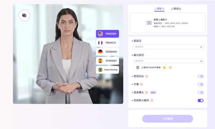核心优势: 在线型视频翻译工具,15种语言即转即用,内建降噪功能提升语音识别率,独创时间轴拖拉编辑,特别适合短视频与社交媒体创作。