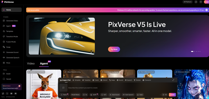 核心优势:新一代 V2 引擎 5 秒即可生成 4K 短片,自带音效还原与人声配音,口型同步免后期,多比例、多风格(写实/卡通/动漫)一键切换。