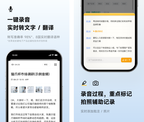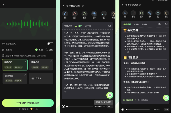 核心功能:实时录音、本地音视频文件都支持一键转文字,支持99种语言及方言;AI自动生成全文摘要、双语翻译与会议纪要,可直接导出Word/Pdf/TXT,知识卡片。