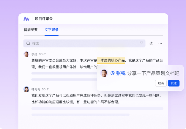 核心功能:会议中实时转写并自动区分发言人,一键生成可分享链接。