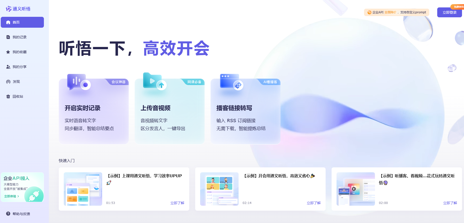 核心功能:阿里云大模型驱动,实时录音、音视频文件双通道转写;自动区分发言人、生成章节标题、提取关键词与待办,支持中英日韩互译。