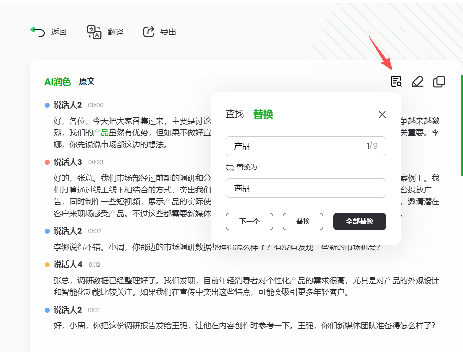 - 说话人自动区分:多人对话自动标注角色,支持手动重命名,阅读与复盘更清晰。
