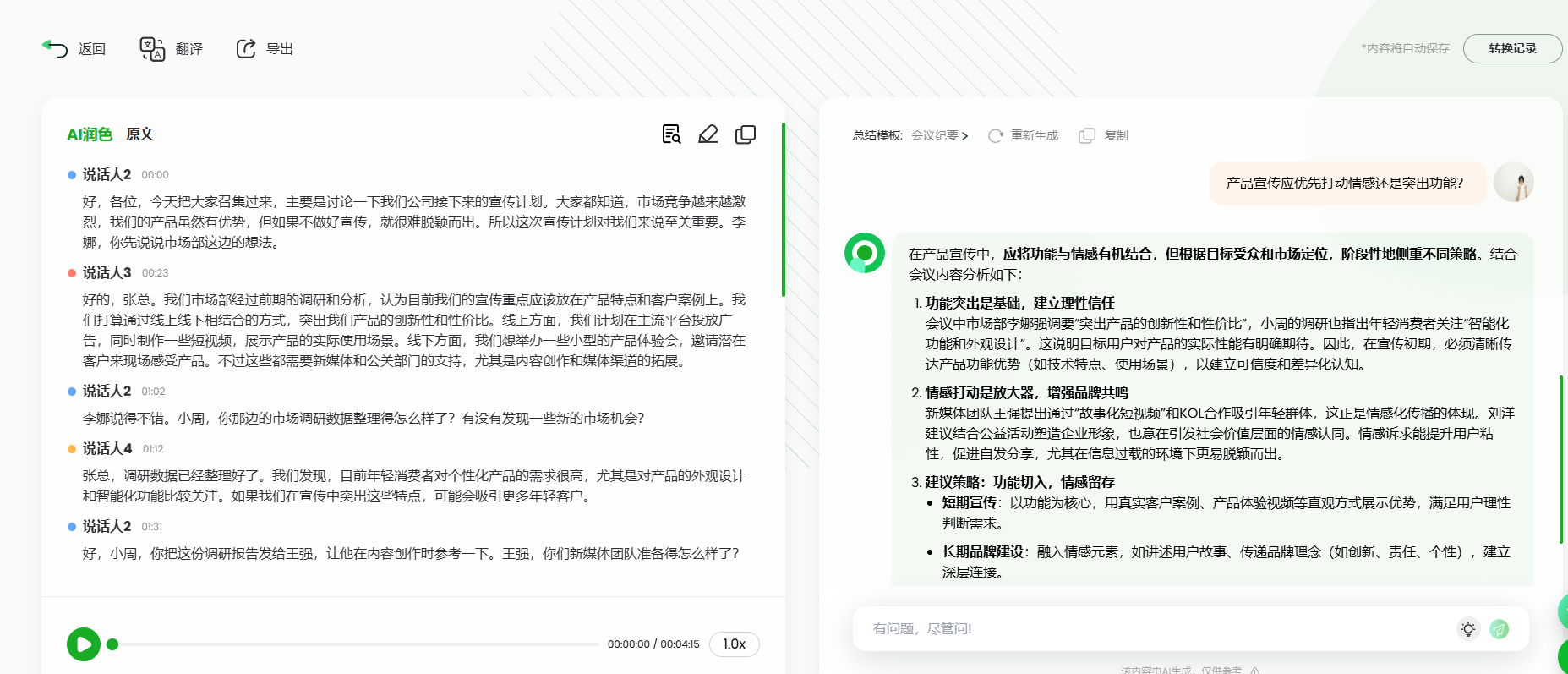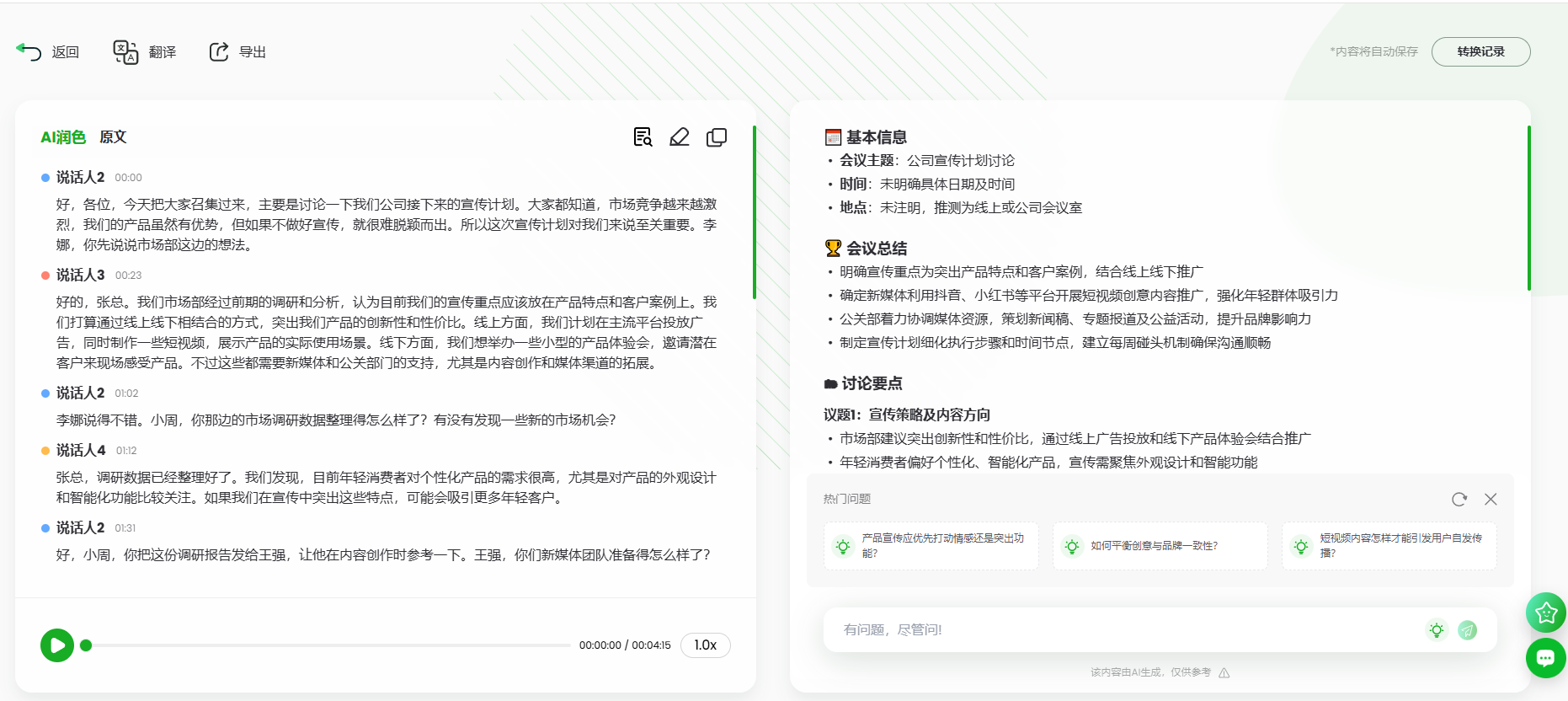 AI对话利用:善用内嵌AI大模型,对转写内容进行提问或生成衍生内容
