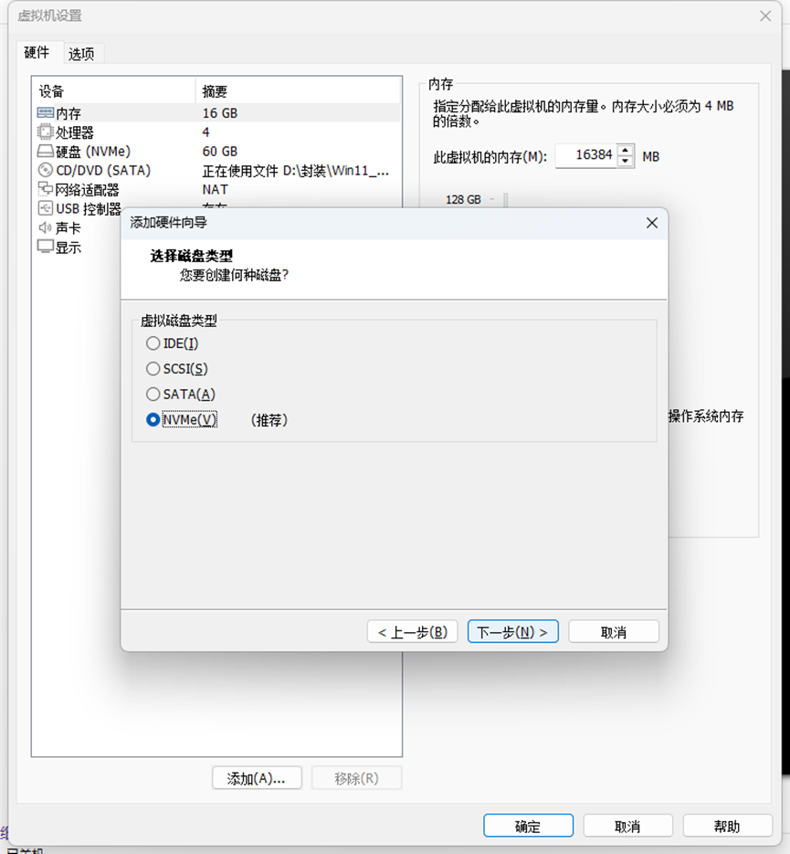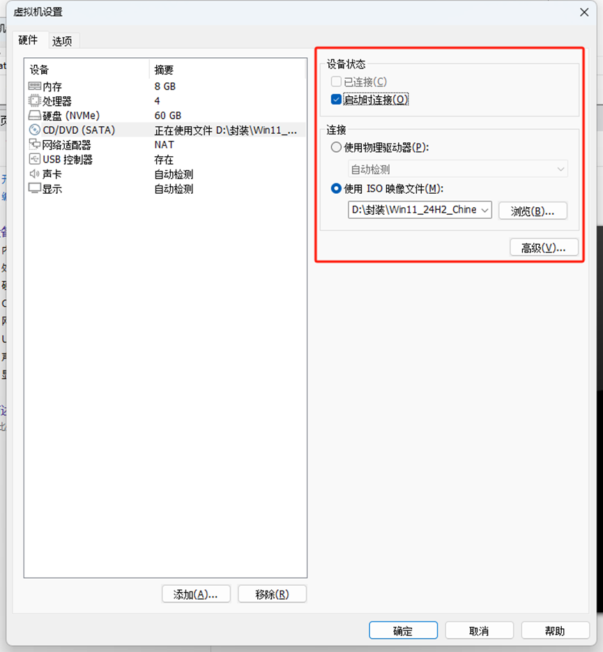 5. 分配足够内存/CPU,载入 Win11 ISO 镜像