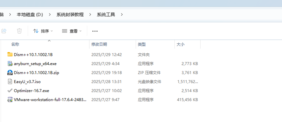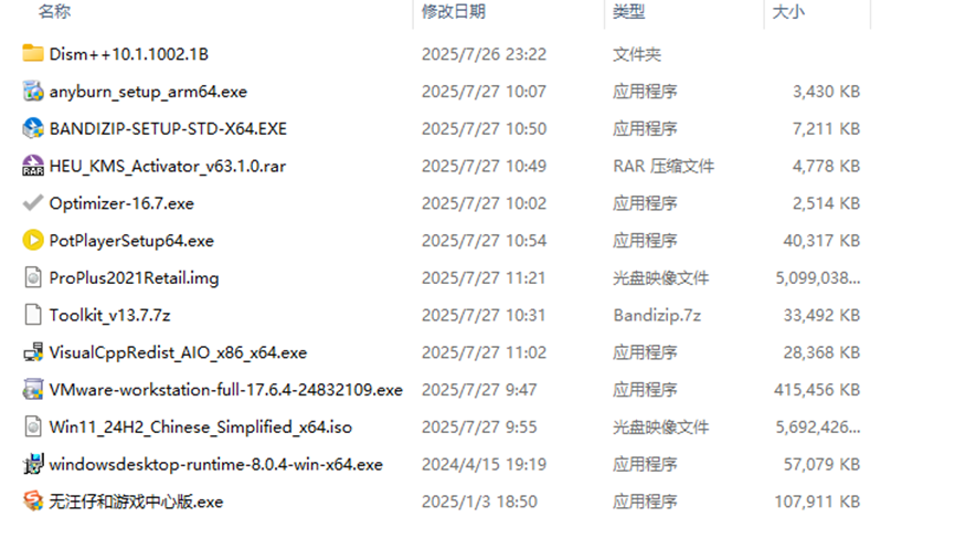 所需工具包含:原版系统 ISO、VMware 虚拟机、Dism++ 工具、常用软件包。